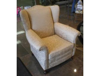 Large wingback armchair, newly reupholstered with tone on tone ivory brocade.  36 1/2" high, 34 1/2 wide.  Seat is approximately 17 1/2" high.  A beautiful and comfortable addition to your home!
