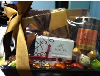 This great gift basket includes: a 22 piece milk chocolate assortment; a smaller box of chocolates; Godiva hot cocoa mix; small box of ultimate dessert truffles; and individual pieces of Godiva Chocolates.