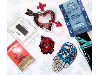 Everything you need to mellow out -- a 2GB iPod Shuffle with headphones, an energizing Feng Shui crystal, a little wooden Buddha, a handmade tin heart ornament, and lavender incense, complete with a ceramic hand incense holder.