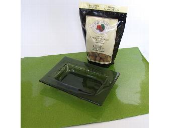 Set includes a mat in sparkly green reversible to black, small glass food dish, and an 8 oz. bag of Oven-Baked Parmesan Cheese Treats for Dogs.