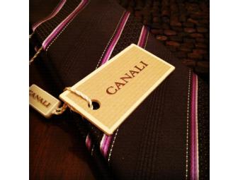 Italian silk tie by Canali, in deep chocolate/purple tones, with lilac accent stripe.