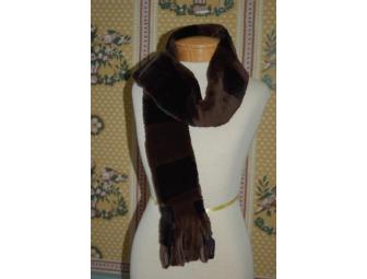 You are bidding on a sheared beaver fur scarf in deep brown, black, and green tones. This 60" long sumptuous scarf is trimmed with fur fringe. Its neutral tones make this a lovely gift for a man or woman.