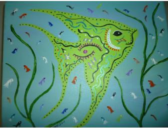 This darling, playful acrylic painting by artist Marilyn Ferguson measures 8" x 10". Unframed, on a 1 1/2" wraparound canvas.