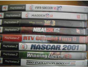 This package includes 8 Play Station 2 games, all are rated E for Everyone: FIFA Soccer 2012, World Soccer Winning Eleven 9, ATV Offroad Fury 2, Pro Evolution Soccer 2012, NBA 2k12, NASCAR 2001, Toy Story 3, Madden 2012. Please see photos for more details.