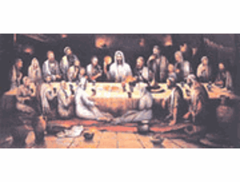 This unusual painting of the Last Supper by Bohdan Piasecki (1998) includes six women and two children, as well as Christ and His twelve apostles. Most classic paintings of the Last Supper (like Leonardo DaVinci’s Masterpiece) only show Christ and His twelve male apostles. But we know from scripture that Christ’s women disciples and His mother Mary had followed Him from Galilee up to Jerusalem, and the next day it was the women who were at the foot of the cross when the men ran away. This painting also shows a traditional Jewish Passover meal, with all the men wearing prayer shawls, eating with their right hands and reclining around a low table on cushions and rugs. In the front of the painting can be seen the basin and a towel from the washing of the feet.