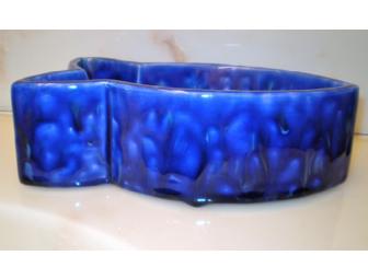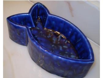 High gloss, blue, ceramic water bowl in the shape of a fish. Glazed in specialty paint which appears to be dripping.