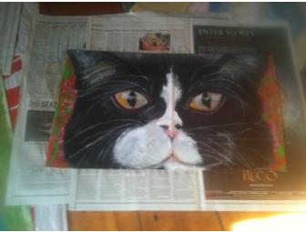 It's floor art! This Cat Mat is painted on professional grade cotton canvas using acrylic paint and water based poly to coat and protect. This small mat, roughly 14 inches x 26 inches is perfect for placing on the floor underneath your cat's food dish. Durable, washable, (wipe with a damp cloth) you can also hang on the wall, place on a bathroom floor or use as a back splash above a sink or counter top. It's a pootie's dream come true.