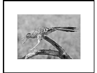 This original 5" x 7" photo is a black-and-white print of a roadrunner leaping over a tree in the California desert. It will be delivered matted to 8" x 10". Matted print signed by the photographer.