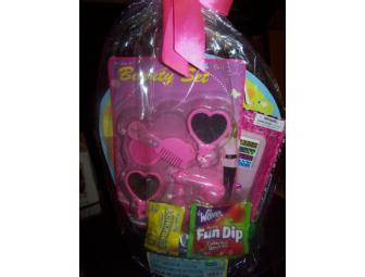 Basket with pretend toy hair dryer, mirrors, comb, brush, fake nail set, Lemonhead lemon candy & Fun Dip.