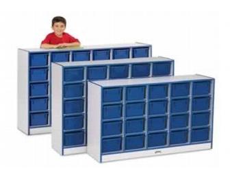 20 tray mobile cubby with trays are a long-term investment for our school's preschool program. With freckled gray laminate and colored accents these twenty cubby will tidy up any classroom.