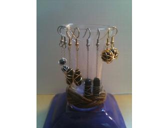 An elegant look at an affordable price! French hooks with black beads wrapped in either silver or gold 26-gauge wire. Presence and length of chain up to you -- requests for customization are always welcome.
