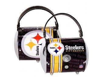 Carry all of your game day essentials in this stylish yet practical handbag. Two full size Pittsburgh Steelers license plates form the body of this unique purse. The bag is felt lined and features a special lipstick holder. (shipping & handling included)