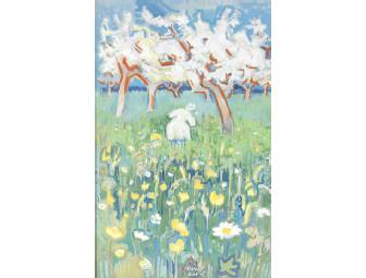 A lone figure appears to be gathering windfall fruit in this delightful painting by the French artist. Gouache on paper, matted and framed. Image is 12" x 19"