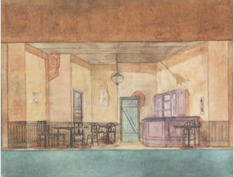 Unsigned watercolor on paper of a somber interior, possibly a sketch for a stage set. Framed and mounted, 12" x 9.25"