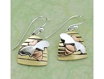 These whimsical earrings featuring bees on their hive are made by Far Fetched and donated by PJ Publications & Gifts. They are made by Taxco artisans in a fair trade setting of .925 sterling silver with mixed metals including copper and brass. The bee with beehive measures about 1/2 by 1/2 inches. Photo has been enlarged to show you the detail.