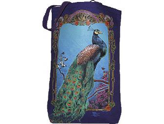 This beautiful and stylish tote bag is made for peacock lovers. The gorgeous peacock image is screenprinted on purple background on the front of the bag. The back is plain purple. The purple background is even more vivid than it appears in the photo. The bag has an open closure and double handles. Made of 100% cotton canvas in the USA. It measures about 19 by 13 inches by 2 1/2 inches. No interior compartments.