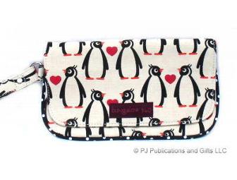 A fun and flirty purse made for penguin lovers! It is perfect for when you want to travel light. The exterior design features penguins in love, and the interior is lined with white polka dots on black material and features a zippered compartment. No exterior compartments. The wristlet has a zipper closure with peace sign pull and side handle. The bag is made of 100% natural cotton canvas and measures about 9 by 5 inches.