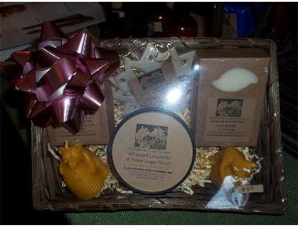 Handmade in the Hudson Valley, this basket has two lavender soaps, lavender and anise sugar scrub, a lavender freshener and two honey bee candles.