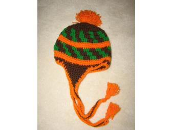 Hand crocheted ski hat with ear flaps. This will look great on the slopes or on the playground.
