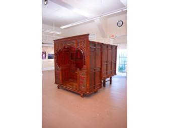 Construction of the bed chamber is fascinating, as no nails or glue were used. All wooden framework, beams, supports, panels, and carvings are held in place by locking together with tension -- making assembly and disassembly simple. In fact, the entire bed chamber can  be assembled in approximately one hour. The only
