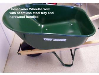 This lot features the "True Temper" homeowner wheelbarrow with seamless steel tray and hardwood handles.