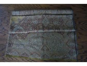 Classic Shawl- 60" x 40" in gold, dark and dark red with blues tones and 1/2" of fringe.