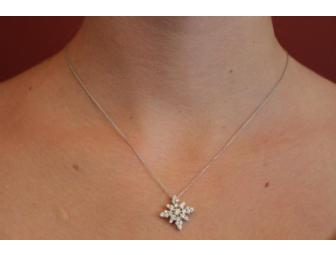 Designed by world-renowned Italian jewelry designer Roberto Coin, this beautiful diamond flower pendant on an 18" 18-karat white-gold chain is a lovely example of the timeless elegance that infuses all of Roberto Coin’s jewelry collections. Total diamond carat weight is 0.98 and the designer’s signature ruby can be found on the back. In 1996, Roberto Coin started signing his jewels by setting a small ruby hidden on the inside of each piece, allowing the distinguished gem to kiss the skin. Since then, this tradition has become the exclusive signature of every jewel by Roberto Coin dedicated as a secret gift of good wishes to every woman lucky enough to wear one of his exclusive creations.