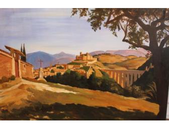 The Hidden Countship has donated this magnificent artwork by Giampaolo Tomasetti, an Umbrian artist famous for his frescoes and beautiful landscape paintings. Tomasetti's artistic depth is rooted in his deep knowledge of ancient and contemporary art, and his works are housed in a prominent gallery in Bologna. The focal point of the painting is the Ponte Delle Torri Bridge, a symbol of Spoleto, Italy, that is a 285-foot-high aqueduct that once carried water and can be traversed on foot. The landscape also includes the Albornoz Fortress, which dates back to the year 1370 A.D. The frame is two-tone black and gold frame with water gilded face custom made from Artizom Frame Gallery. Size of painting: 25" H x 3' W. Oil on canvas. 2001.