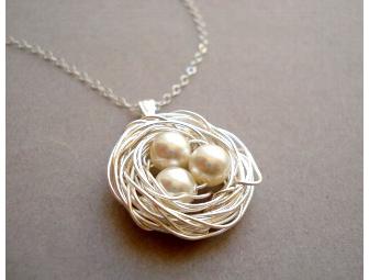 This delicate and beautiful necklace is hand crafted by Monica Sparks. It is made of tarnish resistant silver jeweler's wire wrap freely around 3 white Swarovski pearls. The result is a natural looking and oh so cute sparrows nest! It hangs from a sterling silver bail which connects to a delicate sterling silver chain that measures 16 inches and closes with a hook and eye clasp. Note that all Monica Sparks jewelry is hand made, and the exact nest in the photo may have slight variances.