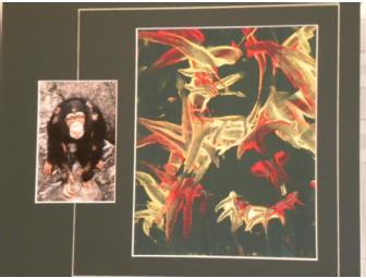 "George" Chimpanzee is only three-years-old, but his artistic talent is already evident in this beautiful painting that evokes thoughts of intricate tapestries. Red and yellow tempera paint looks gorgeous on a rich green canvas background. The dark green matte with white accents dramatically highlights the artwork. Professionally matted by FastFrame. Dimensions: 15" x 18"
