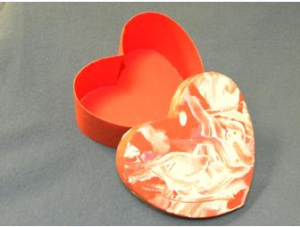 This 5"x6"x3" red heart-shaped cardboard box is lovingly decorated with white and pink tempera paint by "George" Chimpanzee . All of your Valentine treasures can be stored in this cute little box! A photo of the artist is included.