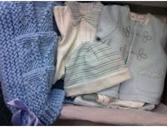 Is there anything better than a hand-knit item from a beloved grandmother? Pingree Grandmother Toni Donarimo has knit a lovely baby blue blanket and her daughter Laurel Galasso has added two Dress Up Baby Boy outfits. Perfect for your new grandson or an adorable shower gift.