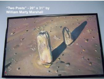 This framed artwork entitled: "Two Posts" measures 20" x 31" and is designed by William Marty Marshall. This is a unique opportunity to own a very special work of art. This piece is on display at the Woburn Senior Center and can be viewed at this location by anyone wanting to see this special painting.