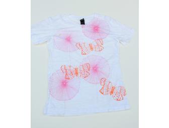 This darling short sleeve natural t-shirt is made of 100% super soft cotton with worn edges on the neck, hem and sleeve opening. The screen print is hand printed using water based inks. The prints are hand drawn and transferred onto a wooden screen frame, and the shirt is hand printed at home. The butterflies are in rich pink and the pinwheels in a bright orange.