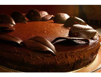 A scrumptions chocolate cheesecake, garnished with edible chocolate leaves! Serves 12.