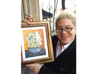 From the collection of Pink Martini's Thomas Lauderdale, this cheerful painting of daises was painted by Phyllis Diller, who is widely credited as being the first woman to successfully pursue a career in stand-up comedy. At different stages in her career she has also been an author, concert pianist, and actress, appearing in sixteen movie roles, often in a supporting role to longtime friend Bob Hope. With a comedy persona based on outrageous wigs, makeup, and a pantomime cackle, Diller's comedic success paved the way for a younger generation of female comics such as Roseanne Barr and Whoopi Goldberg.