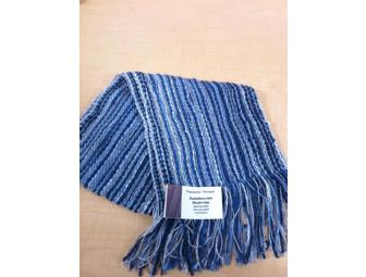 Handwoven scarf made from rayon and silk. Blue with grey accents.