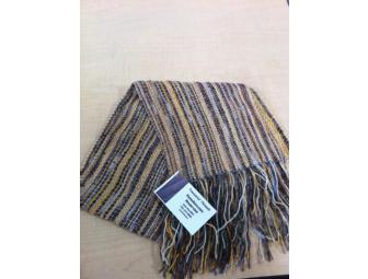 Handwoven scarf made from rayon and silk. Gold with brown accents.