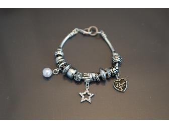 Hearts, stars and pearls enhance this silver charm bracelet which is loaded with unique beads.