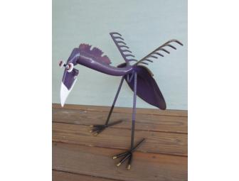 This unique piece of art is made out of various metal tools: a shovel, straight rake, circle saw blade, rebar, and a sickle bar mower tooth.