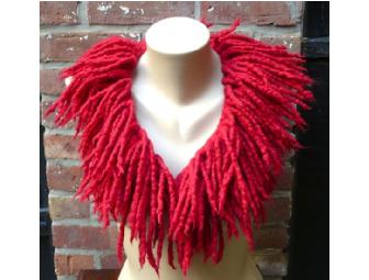 FRINGE FESTIVAL is made of hand-dyed Peruvian merino wool yarn, crocheted and knotted into a shaggy collar, then felted into long dreadlocks that keep you warm while showing your wild side — and your sexy clavicle! It has a hook and eye closure, and comes with black organza ribbons in case you want to rock a bow. It would also look great with a large brooch pinned at the center.