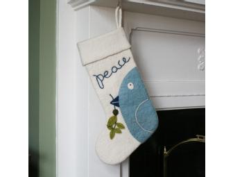 Beautiful Wool "Peace" Holiday Stocking from popular local Libbie & Grove gift store. Item pictures blue bird holding holiday sprig.
