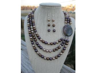 This is a 3 strand glass pearl and silver necklace with a natural stone pendant clasp. It is worn asymmetrically on either the right or left side. Included is a matching pair of earrings with sterling silver fishhook earwires. The colors in both are a deep purple and a light and dark brown. There are also some blue hues in the pendant clasp.