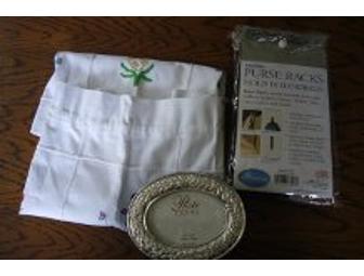 This package includes a handy adjustable holder for up to 16 purses, scarves, hats or other items. Also included is a small cloth laundry bag, a 3 1/2 x 5 oval frame and a decorative trinket box with mirror.