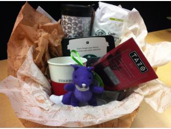 Package includes: 1 hot beverage travel mug, a reusable coffee sleeve, a package of Caf Estima Blend Coffee, a package of Tazo "Joy' tea, a Tazo tea cup, an 8oz. Starbucks mug, and a Starbucks ornament collection ornament.