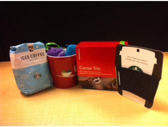 Package includes: A Cocoa Trio box with three rich, creamy hot cocoa mixes including peppermint, double chocolate, and salted caramel, a package of Stabucks' Iced Coffee Blend coffee, a reusable coffee sleeve, two Starbucks Ornament Collection ornaments, and a large Starbucks coffee cup.