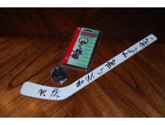 Includes three (3) items: a keychain, a collectable coin with team seal, and a miniature hockey stick with players' autographs