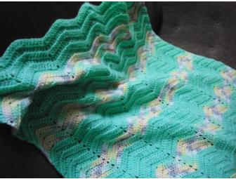 This pastel green blanket will soon become a treasure. It is crocheted in the wave-rib pattern. The green is offset with stripes of pastel pink, yellow and lavender.