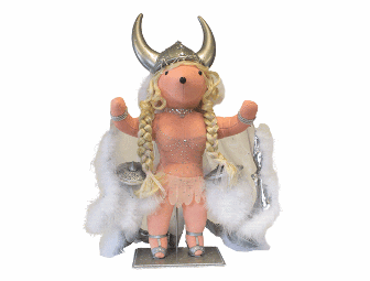 Behold our curvaceous and stately Valkyrie Showgirl bear, inspired by the Broadway hit The Producers. She is clothed in a sheer body suit, studded with rhinestones and bugle beads. An organza scallop-shaped girdle, decorated with rhinestones and beads, hugs her lower hips. Large rhinestones create a glamorous choker and the wristbands are encrusted with silver beads and clear bugle beads. The pannier is represented as two battle shields, delicately balanced on her hips. The underside of each shield is adorned with white marabou and wire-strung beads. Her open-toed shoes are constructed from polymer clay, paper, wire, leather, acrylic paint and rhinestones. The voluminous organza cape has a scalloped lamé edge, edged with marabou. Our Valkyrie bear wears a double-horned helmet constructed of thermoplastic, paper, sparkling acrylic paint and studded with rhinestones. The back has a flourish of white marabou with wired, beaded tendrils. Her long, blonde braids are intertwined with decorative ribbons and silver strands. She stands permanently on her own star-studded base, ready to fight the ancient Norse gods to earn a place in your home.