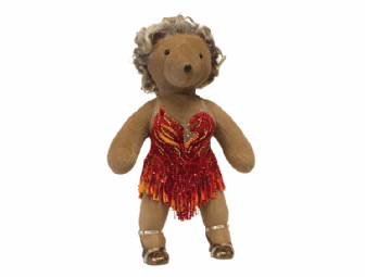 All aboard the S.S. American where evangelist Reno Sweeney will set your heart aflame. This fiery, orange-and-red sequined number is a replica of the dress worn in the second act opener, “Blow, Gabriel, Blow!” In the number, Reno and her angels turn up the heat for the ship’s guests and crew, and now you can join in the party. Our Reno bear wears a dress of red and orange stretch velvet with flame cutouts encrusted with genuine Swarovski crystals and strands of sequins for flapping, an exact replica of the original worn by Sutton Foster in the 2011 Tony Award-winning revival. Under the dress is a pair of red panties adorned with more crystals. Her handmade shoes with working buckles are made of glittered, vinyl material with leather straps in metallic finishes. The soles also are made of real leather with rubberized heels so she won’t slip when she’s doing her infamous kicks. Reno’s blonde locks are a handmade lace-front wig tied with real human hair. If you need your soul to be saved, come find Reno because this evangelist is ready to preach.